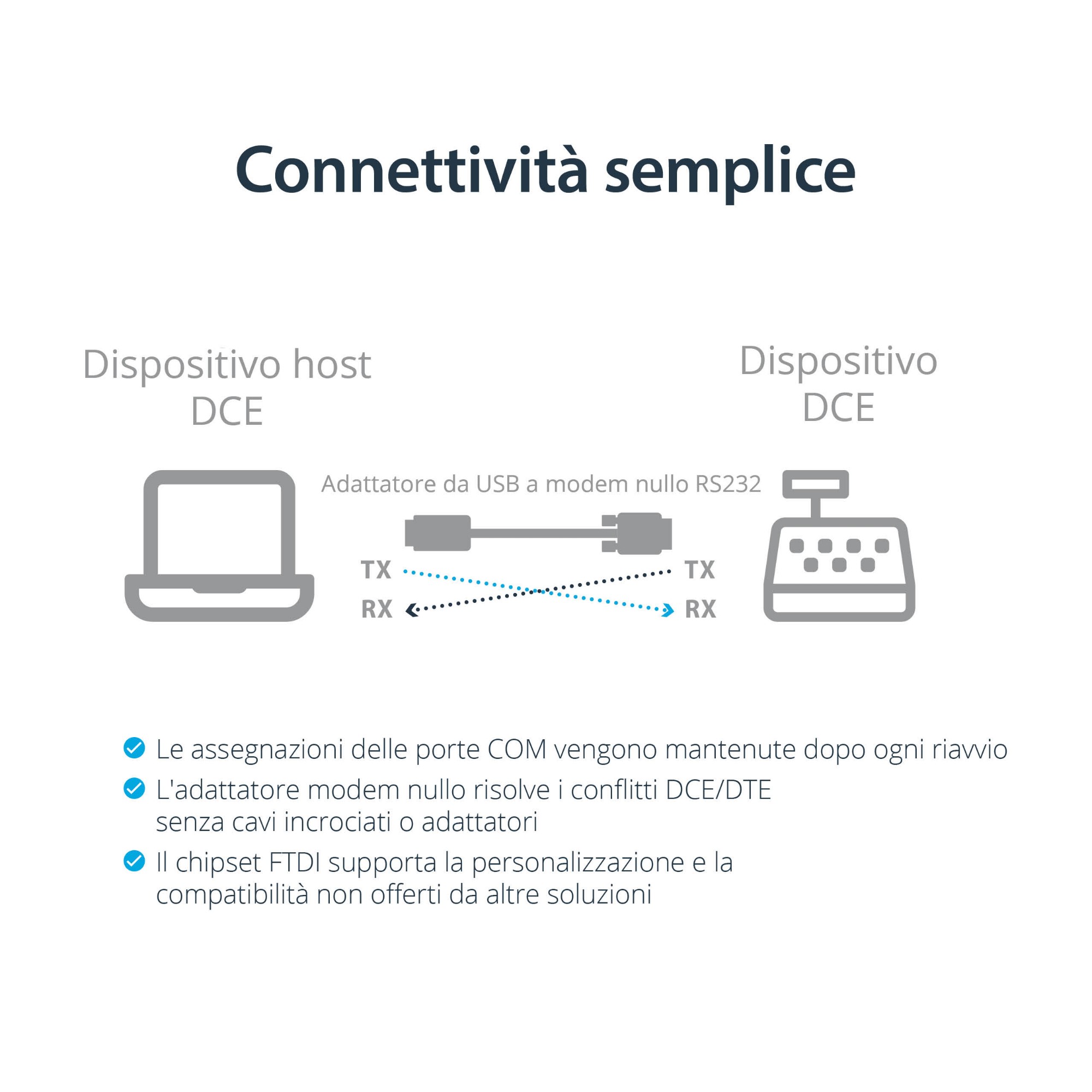 Possibilità di aggiungere una porta seriale RS232 null modem al computer desktop o laptop tramite USB
