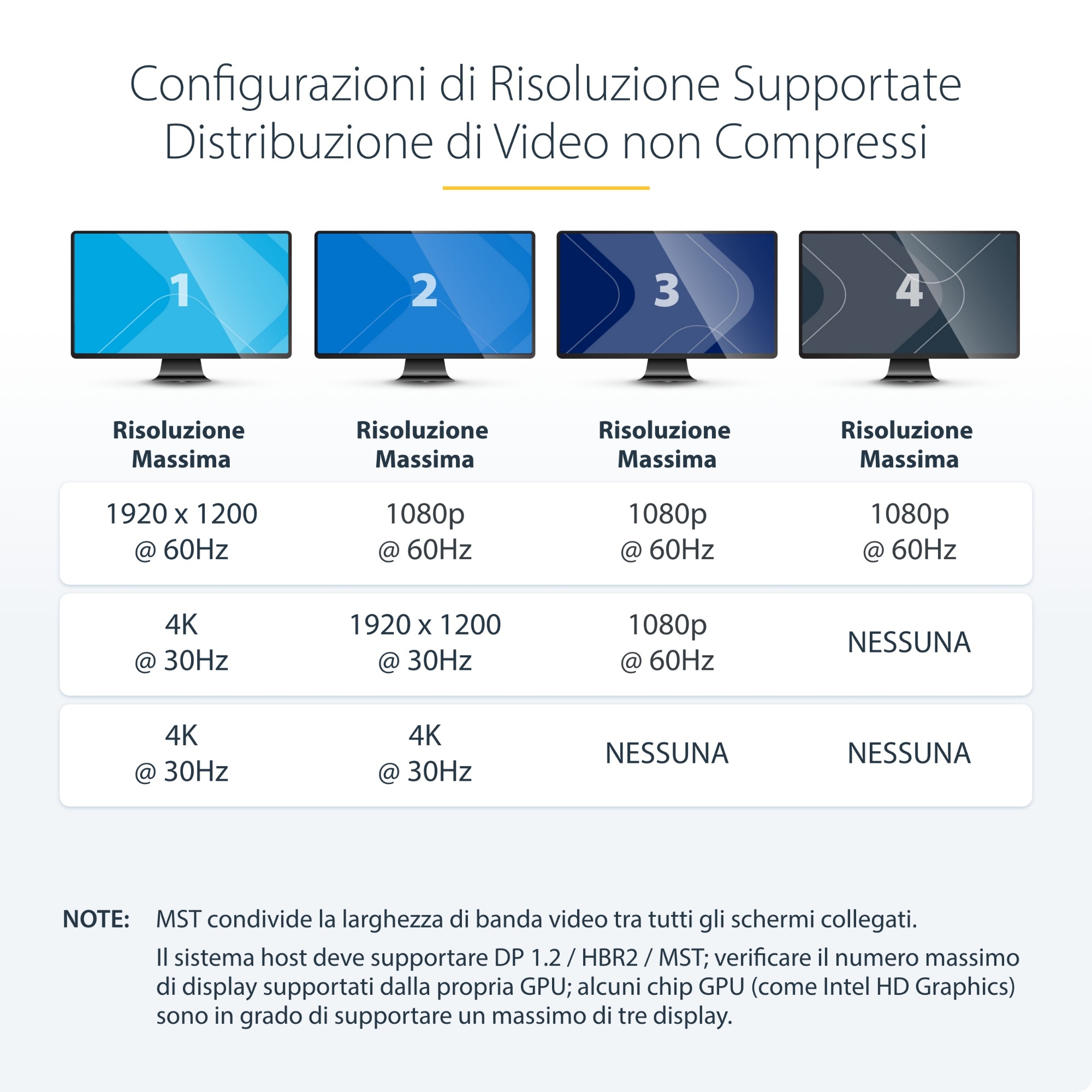 Nota: MST condivide 21,6 Gbps tra tutti i display collegati. Risoluzioni superiori possono limitare la larghezza di banda disponibile per le restanti porte, consultare le nostre linee guida di seguito per determinare la risoluzione ideale per l'impostazione scelta. Alcuni adattatori grafici hanno un supporto MST limitato e consentiranno la trasmissione solamente su tre display complessivi. Qualora siano collegati più di tre monitor, il quarto verrà disattivato.