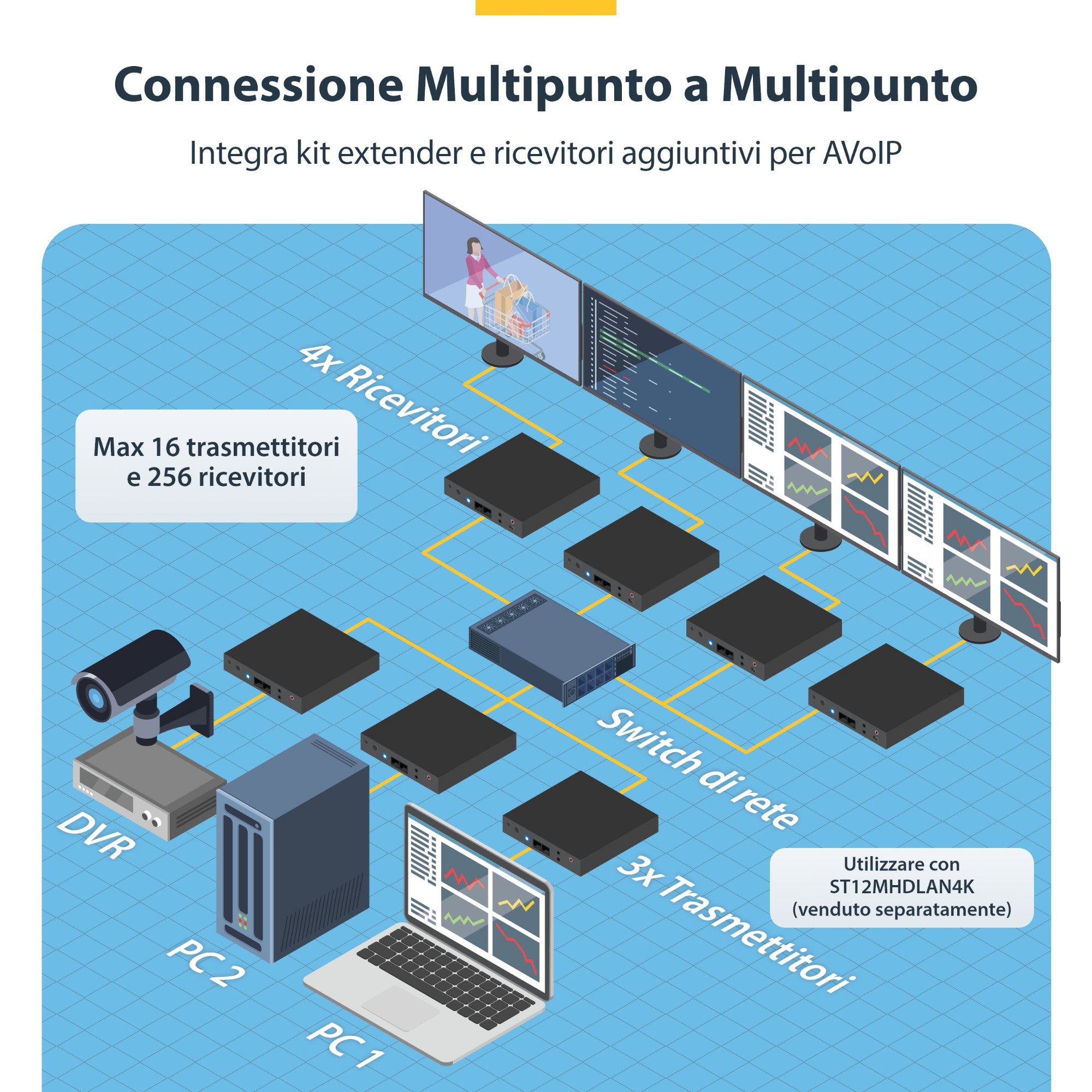 La possibilità di aggiungere vari ricevitori al kit extender HDMI via IP consente di creare un video wall o una configurazione point-to-multipoint. In questo caso è possibile integrare altre fonti (trasmettitori) con molti altri display (ricevitori) tramite lo switch Gigabit Ethernet gestito con IGMP. Per una maggiore scalabilità, è possibile combinare complessivamente fino a 16 fonti (trasmettitori) e tanti ricevitori (display) quanti ne supporta la larghezza di banda della rete.