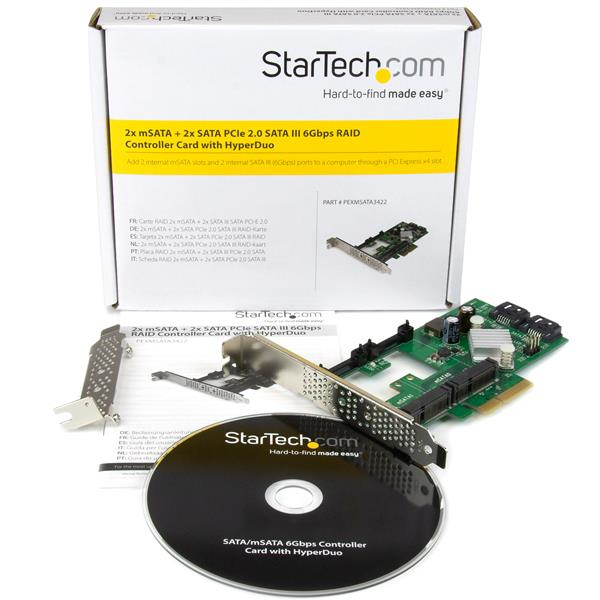La scheda SATA PCI Express PEXMSATA3422 permette di migliorare la velocità complessiva e la capacità di archiviazione del computer offrendo molteplici collegamenti SATA da 6 Gbps per il collegamento di unità SSD (unità a stato solido) e dischi rigidi ad alte prestazioni in un array HyperDuo. Ora è possibile aggiungere con facilità due slot mSATA e due porte SATA III al computer utilizzando un solo slot x4 PCIe.