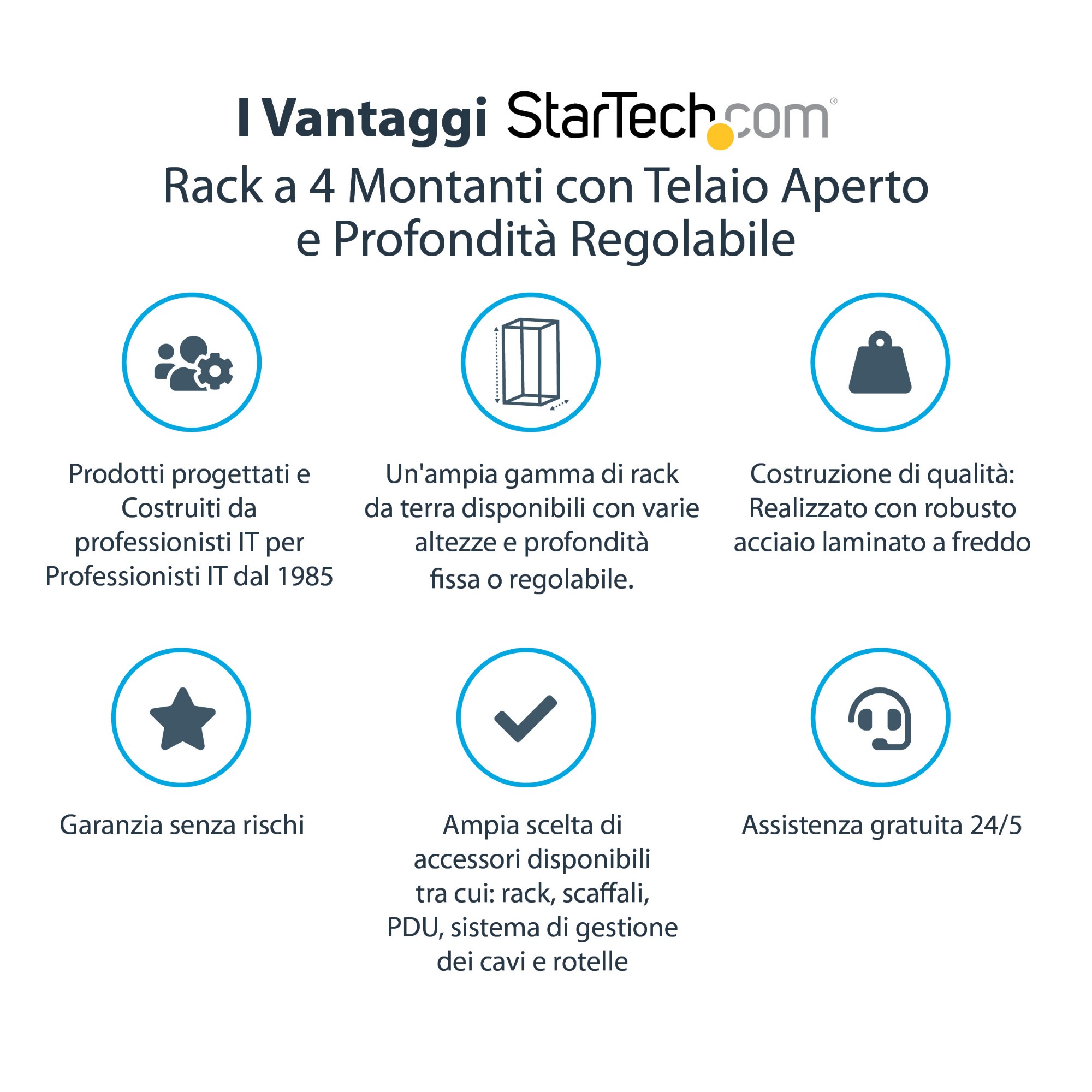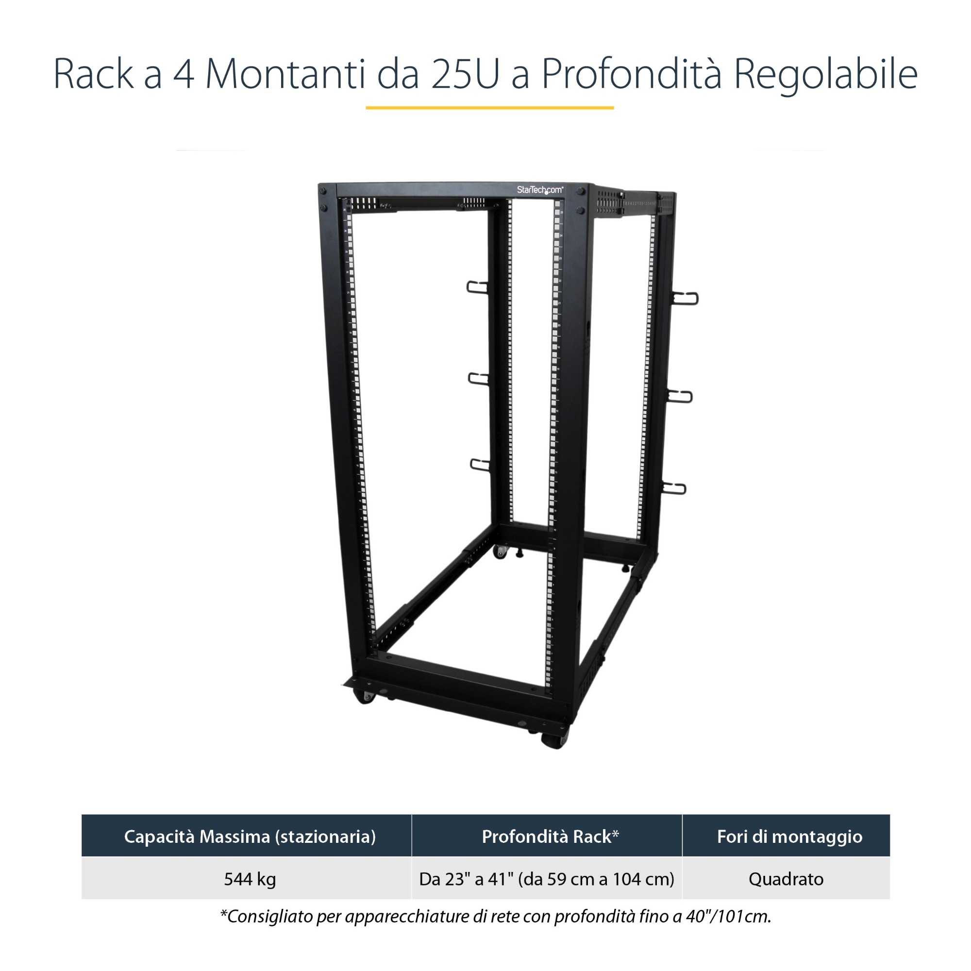 StarTech.com Server Rack a 4 Montanti 25U Open Frame, Armadio Rack di Rete 19" con Ruote, piedini di livellamento/montaggio a pavimento, Quadro Rack Scorrevole/profondità regolabile per apparecchiature AV/Dati/IT
