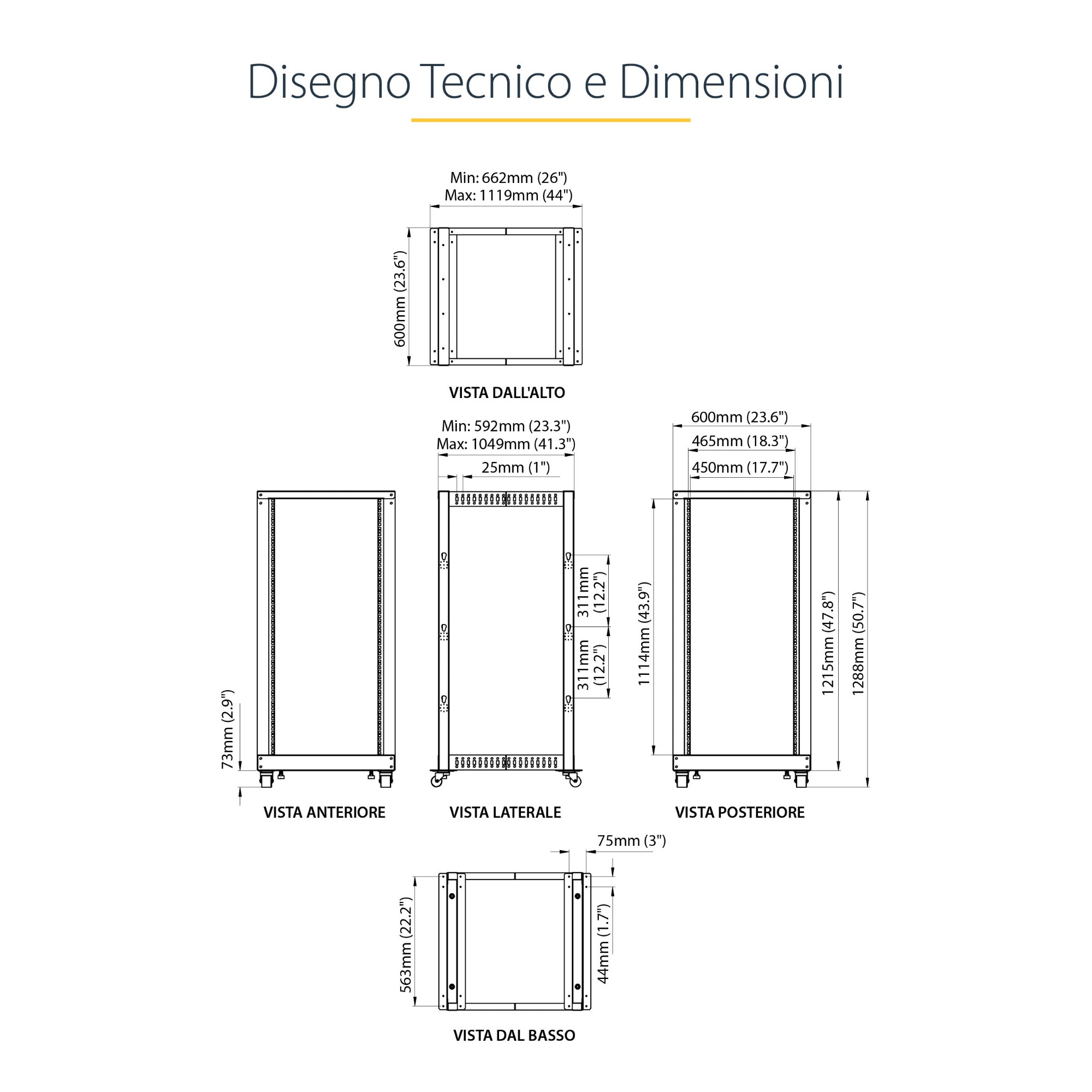 Progettato per un impiego agevole, questo rack da 25U presenta marcature per unità rack (U) e profondità di facile lettura, con un'ampia gamma di regolazioni della profondità di montaggio da 56,0-101,7 cm (22 - 40") che semplificano l'adattamento del rack alle apparecchiature.