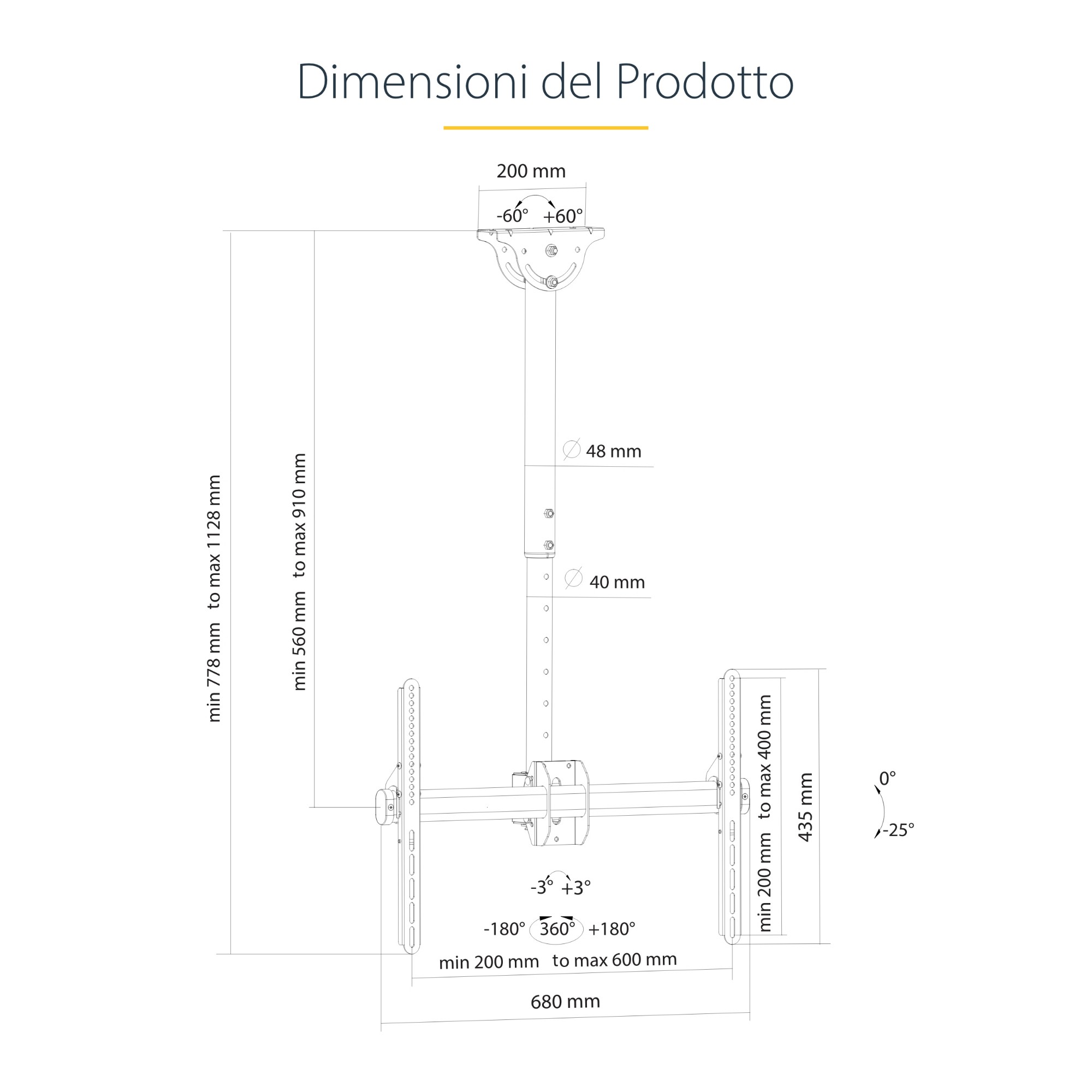 Il supporto da soffitto per schermi piatti è compatibile con molti tipi di soffitto e consente di ruotare il televisore in modo da adattarsi a qualsiasi ambiente, dai soffitti spioventi (fino a 60 gradi) e inclinati a quelli orizzontali (piani), in modo che il display sia collocato sulla linea di visuale.