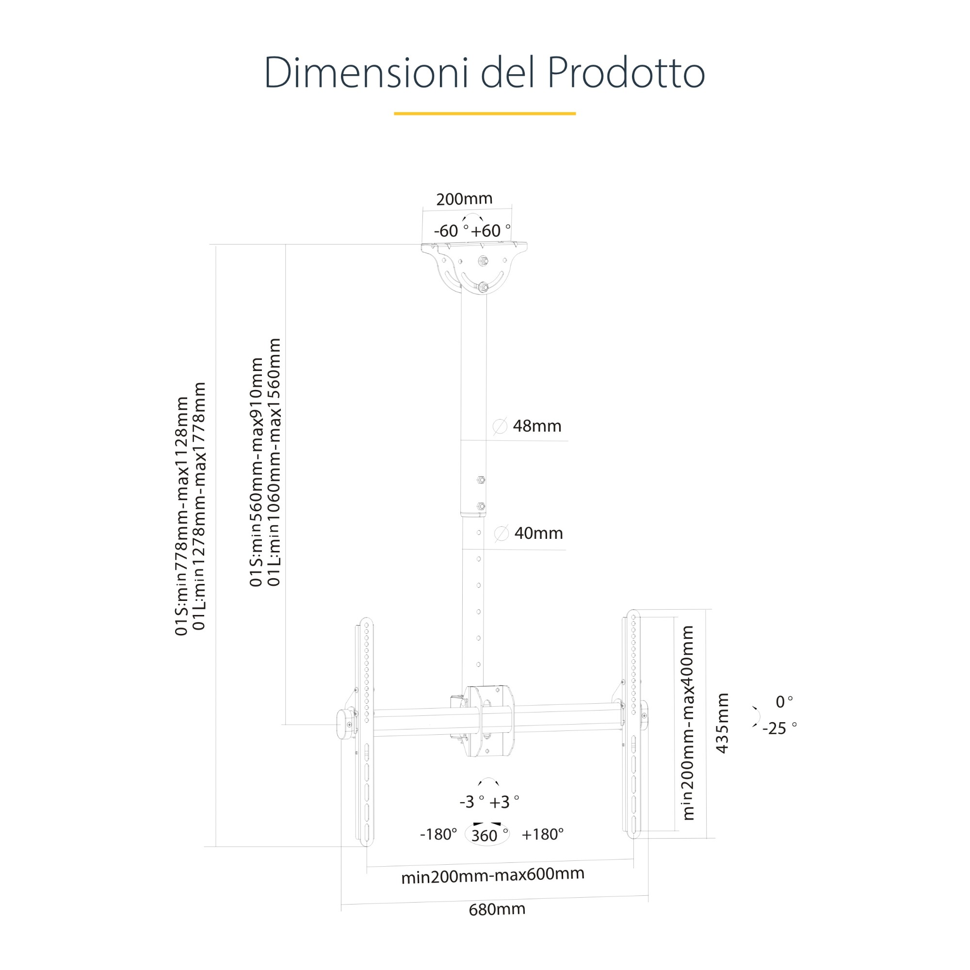 Il supporto da soffitto per schermi piatti è compatibile con molti tipi di soffitto e consente di ruotare il televisore in modo da adattarsi a qualsiasi ambiente, dai soffitti spioventi (fino a 60 gradi) e inclinati a quelli orizzontali (piani), in modo che il display sia collocato sulla linea di visuale.