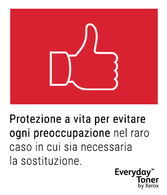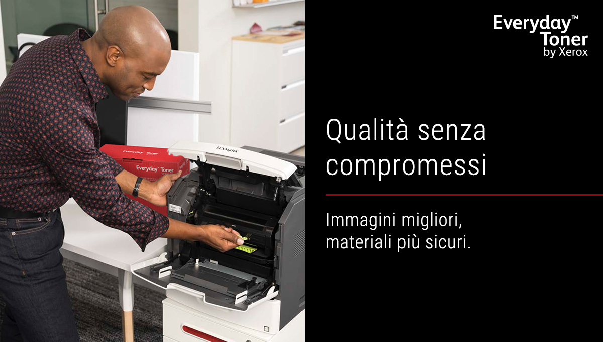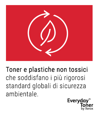Un impegno di responsabilità ambientale rappresenta l’approccio migliore dal punto di vista commerciale, per il suo impatto positivo sul pianeta, sull’azienda e sulle persone. Il Toner rigenerato Everyday di Xerox produce un’impronta di carbonio minore rispetto a qualsiasi altra cartuccia di toner a singolo utilizzo. Perché non si dovrebbe essere obbligati a scegliere tra fare la propria parte per ridurre l’impatto sull’ambiente e il costo del toner. E la compatibilità con le marche di stampanti più diffuse ti permette di usufruire dell’impareggiabile qualità e impegno ambientale di Xerox indipendentemente dalla stampante che utilizzi.