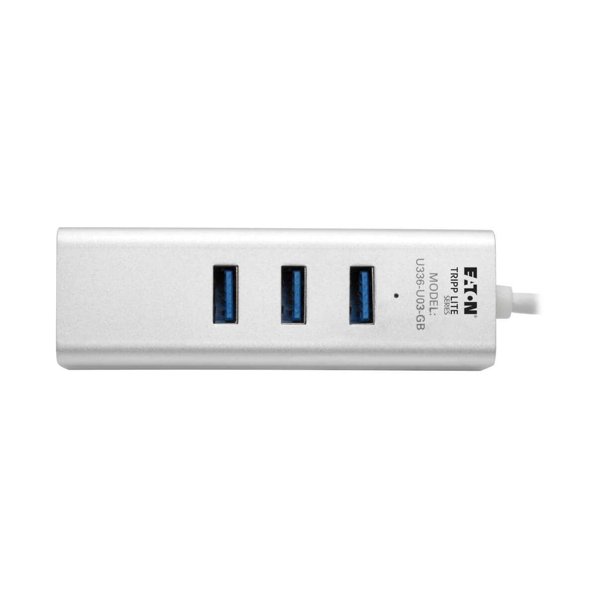 Tripp Lite U336-U03-GB. Standard di rete: IEEE 802.3az. Colore del prodotto: Argento, Interfacce hub: USB 3.2 Gen 1 (3.1 Gen 1) Type-A, Paese di origine: Cina. Frequenza di ingresso AC: 50 - 60 Hz, Voltaggio di uscita: 5 V, Corrente d'uscita: 2,5 A. Larghezza: 44,4 mm, Profondità: 104,8 mm, Altezza: 23,8 mm. Larghezza imballo: 73,7 mm, Profondità imballo: 144,8 mm, Altezza imballo: 28,4 mm